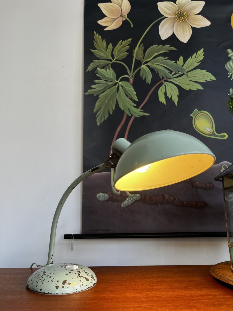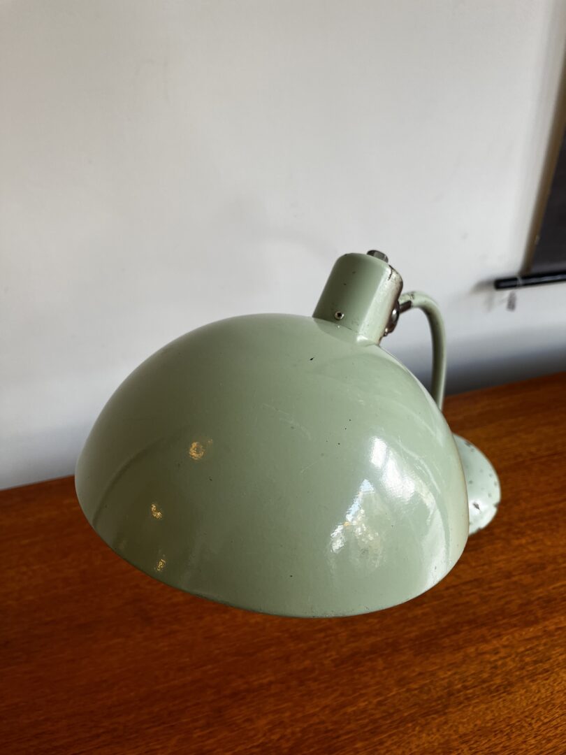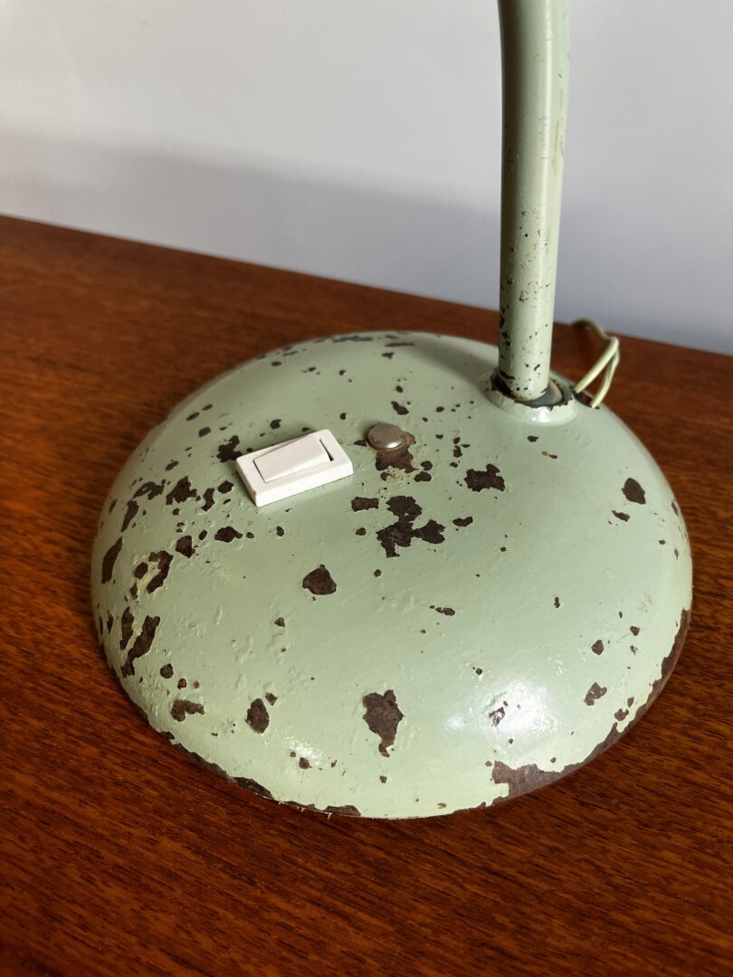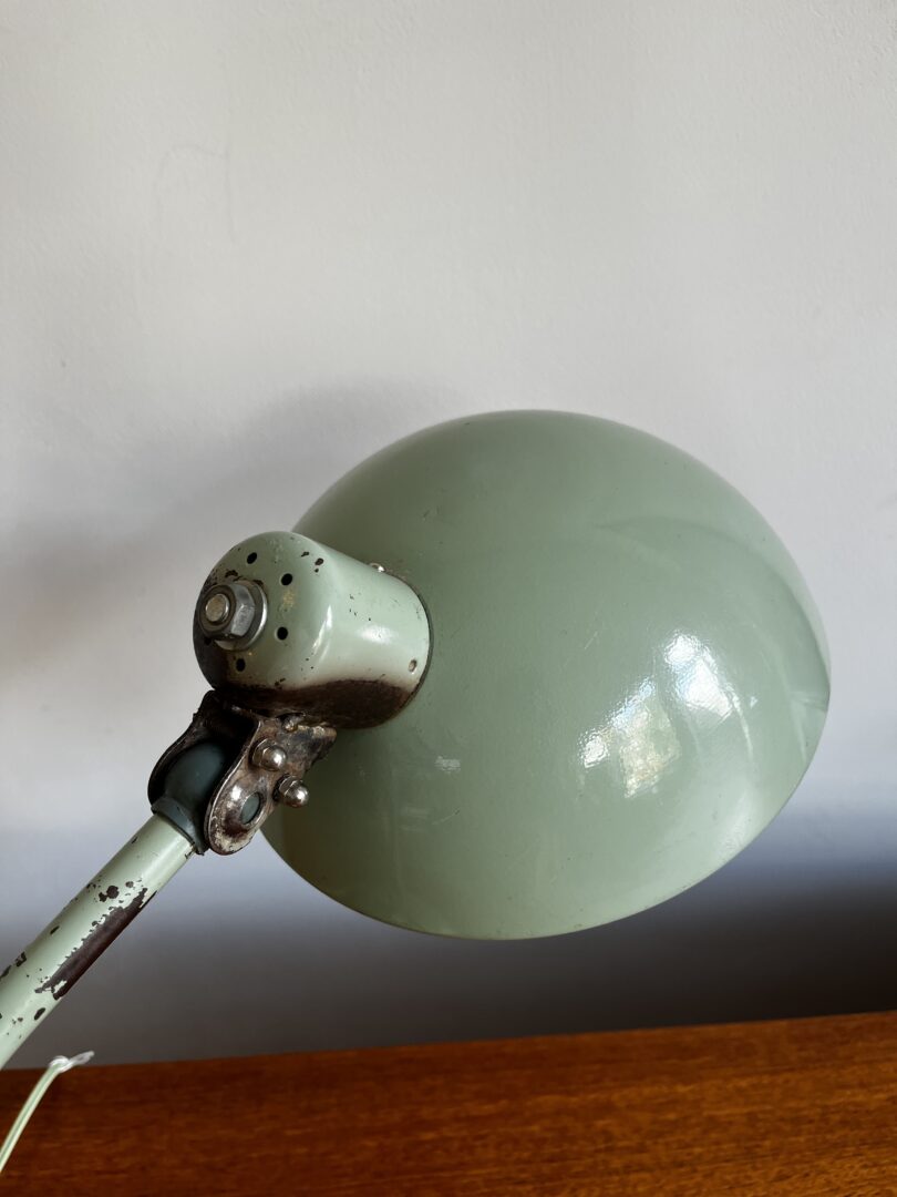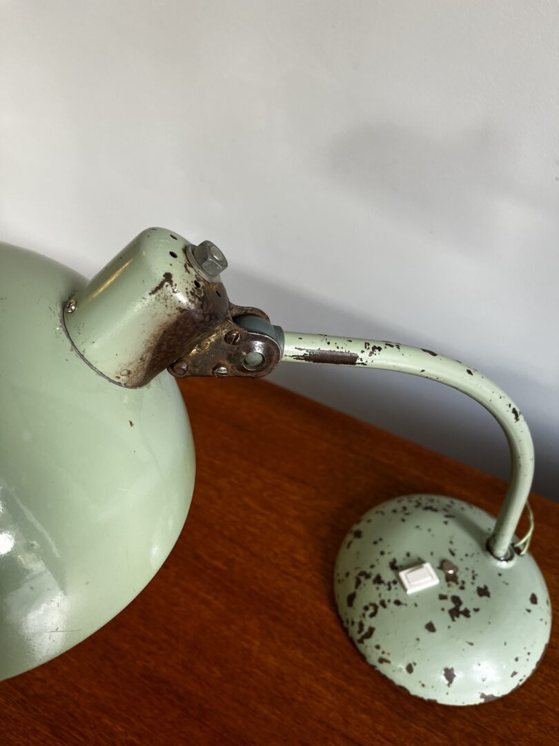 Vintage Bauhaus bureaulamp uit de jaren ’50 die barst van karakter. Tis de patina op het metaal van pastelgroen dat hetβm doet ππ½