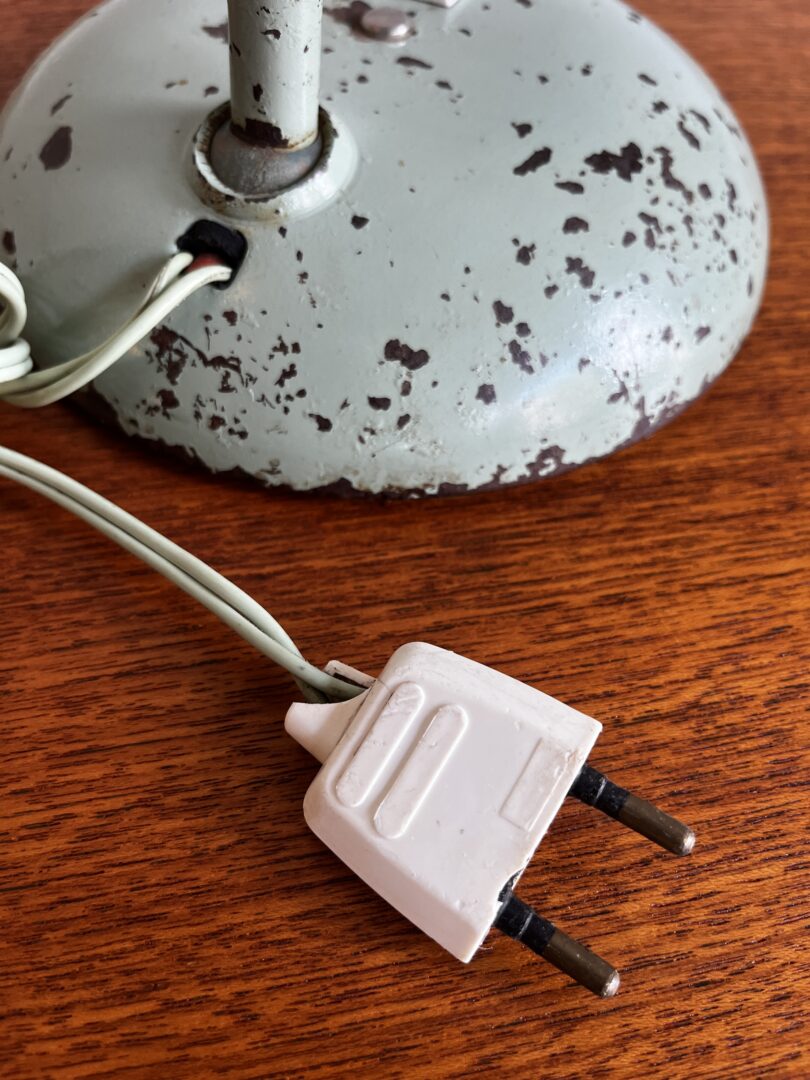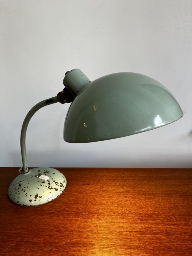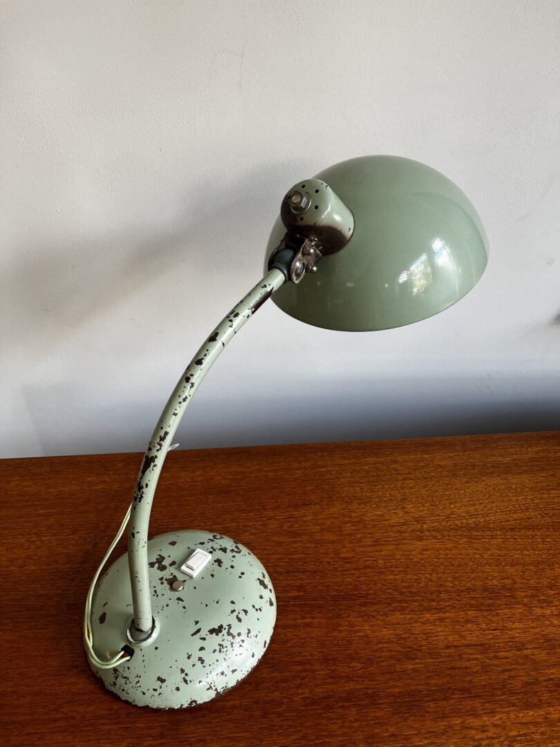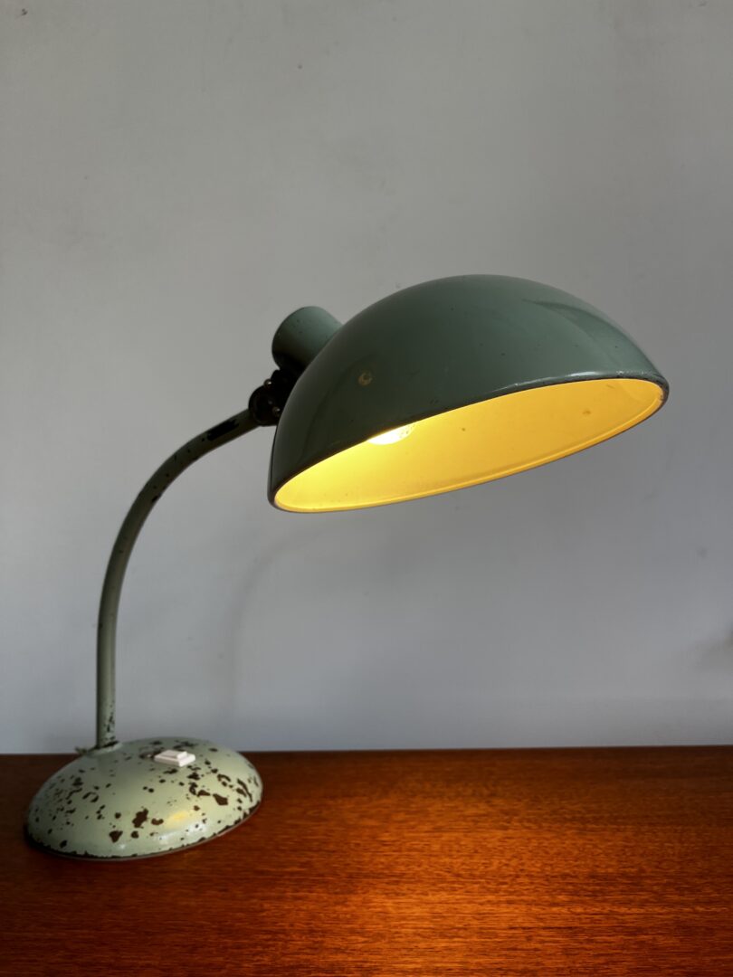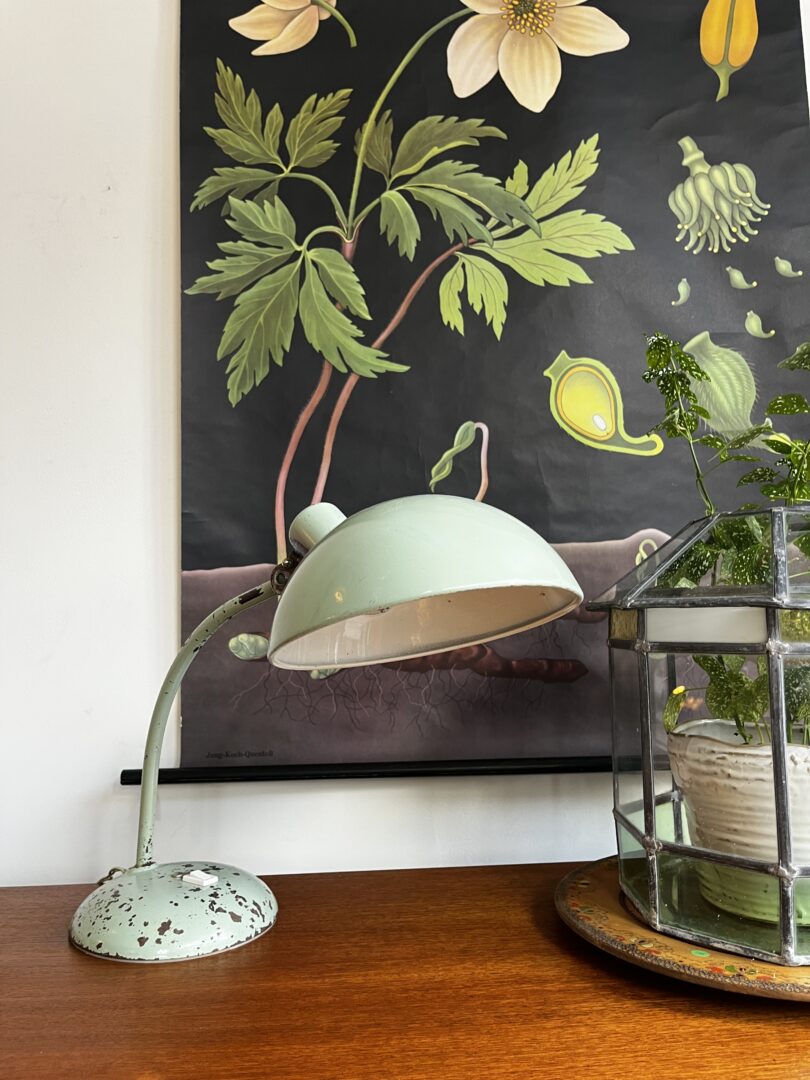 Vintage Bauhaus bureaulamp uit de jaren ’50 die barst van karakter. Tis de patina op het metaal van pastelgroen dat hetβm doet ππ½
