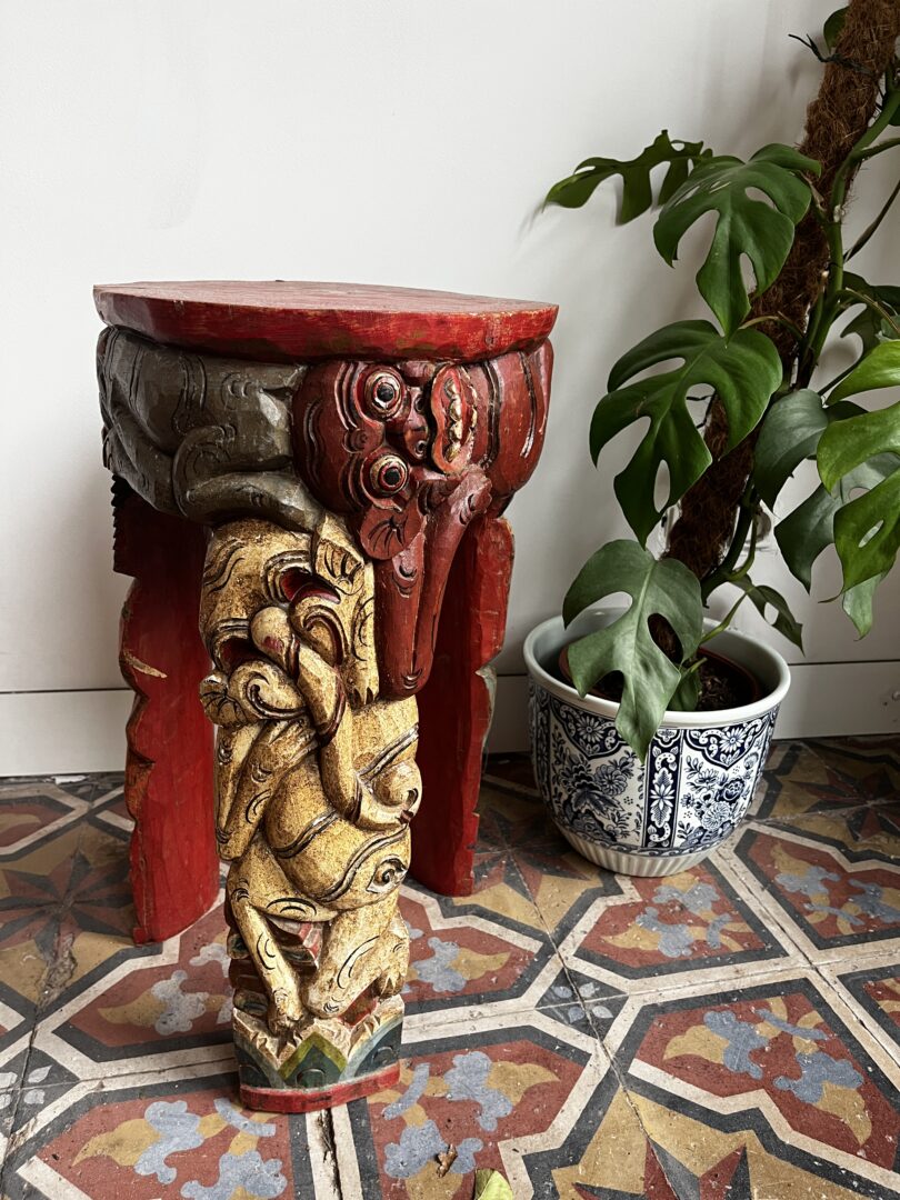 Fantastisch handgebeitelde en handbeschilderde bijzettafel met mythologische taferelen.